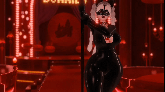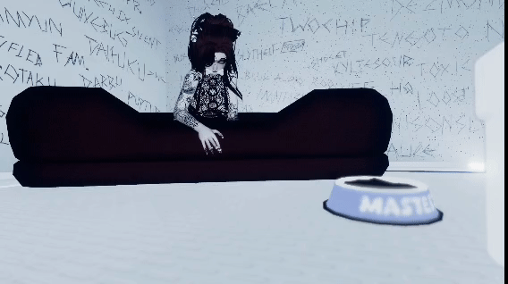 Suit off, Fishnet top, Latex skirt, Rope, Harness, panties, Pup hood>hood ears>both>none, hair (pigtails>long>messy bun), dog toy, dog bone, White latex, hue latex, whip, Nora, drobable cage, cage door close, Droppable pet bed/bowl