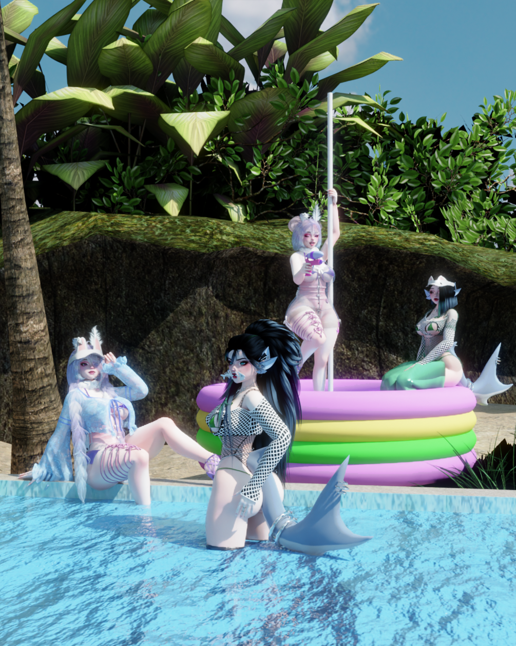Hair (short, bun, long), Everything toggles off, Shark floatie, pole, dancer fans. Hue swaps for everything, har mat swaps (blonde, red, brown, and white). Poc skin swapsย ย